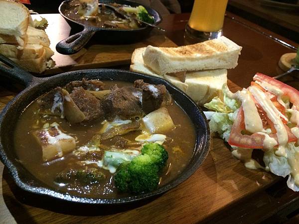 將將!!!主菜終於上囉~鐵鍋系列>>紅酒燉牛肉 以美式方式放在木板上~