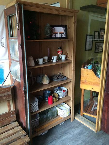 門口放置一個木製櫃子內有盤子和馬克杯及一些擺飾